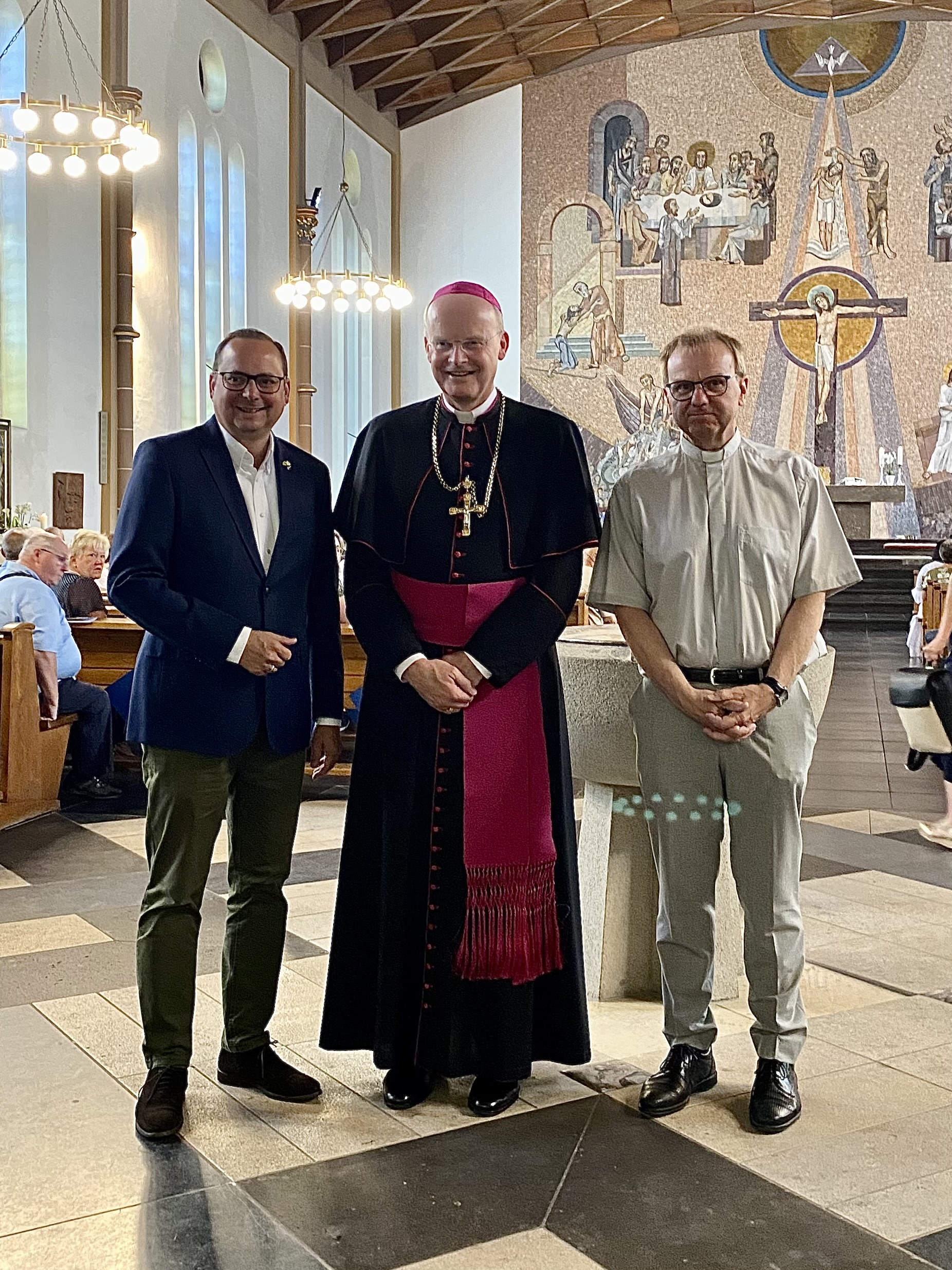 Thomas Kufen (l.) und Michael Dörnemann (r.) heißen Franz-Josef Overbeck vor der Sankt Gertrud Kirche willkommen.