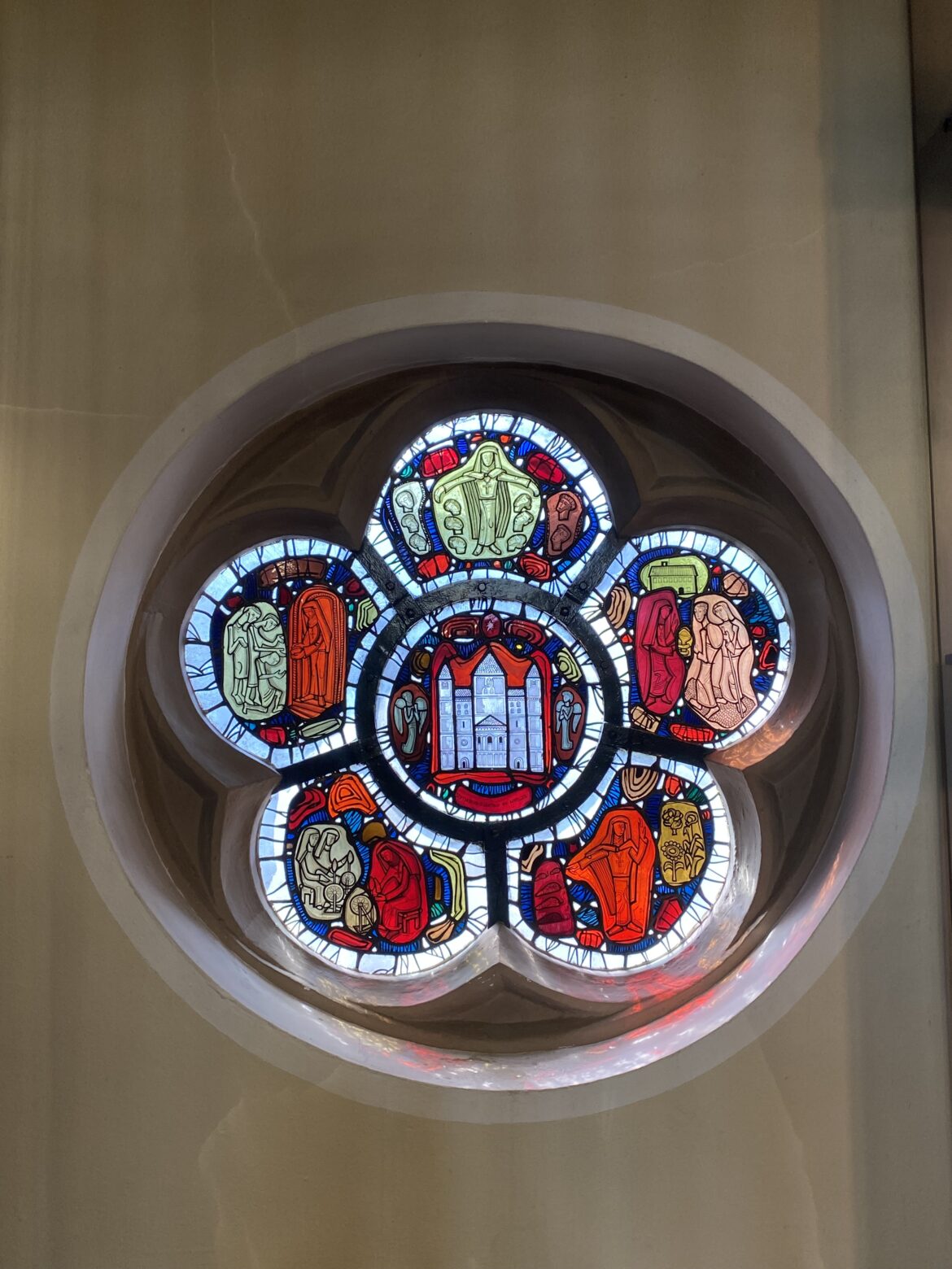 Das Bild zeigt ein Kirchenfenster der Sankt Gertrud Kirche in Essen. Es besteht aus fünf kleinen „Blütenblättern“ und einem Kreis als Kern, der die Kirche abbildet. Jedes Blatt zeigt eine gute Tat der Heiligen.