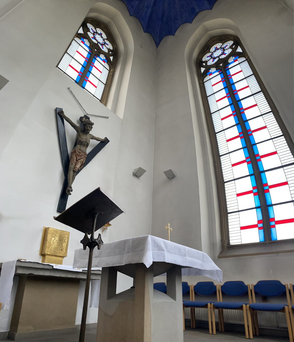 Michael Dörnemann sitzt auf einem Holzstuhl mit blauem Polster. Er befindet sich in einem Seitenraum der Sankt Gertrud Kirche in Essen, der hohe weiße Wände und eine blaue Decke hat.