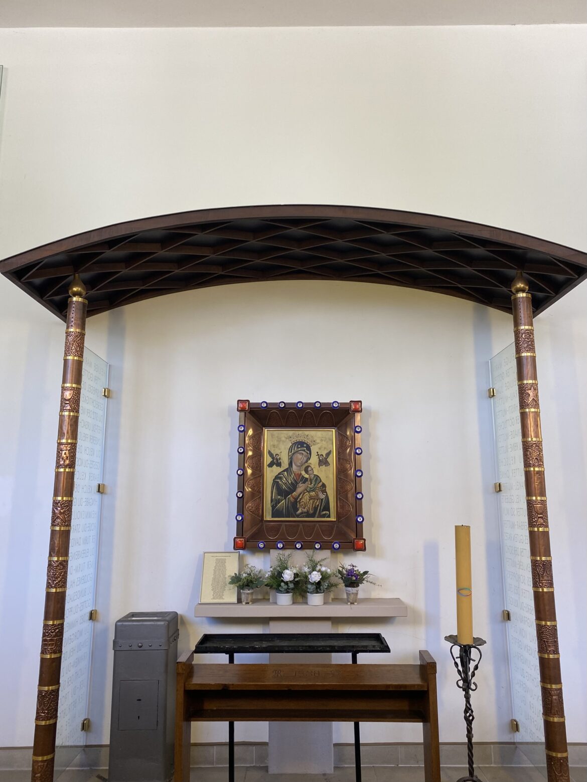Eine einzige Kerze steht vor dem Altar der Sankt Gertrud Kirche in Essen. Im Hintergrund ist das große braune Wandmosaik zu erkennen, dass Jesus am Kreuz zeigt.