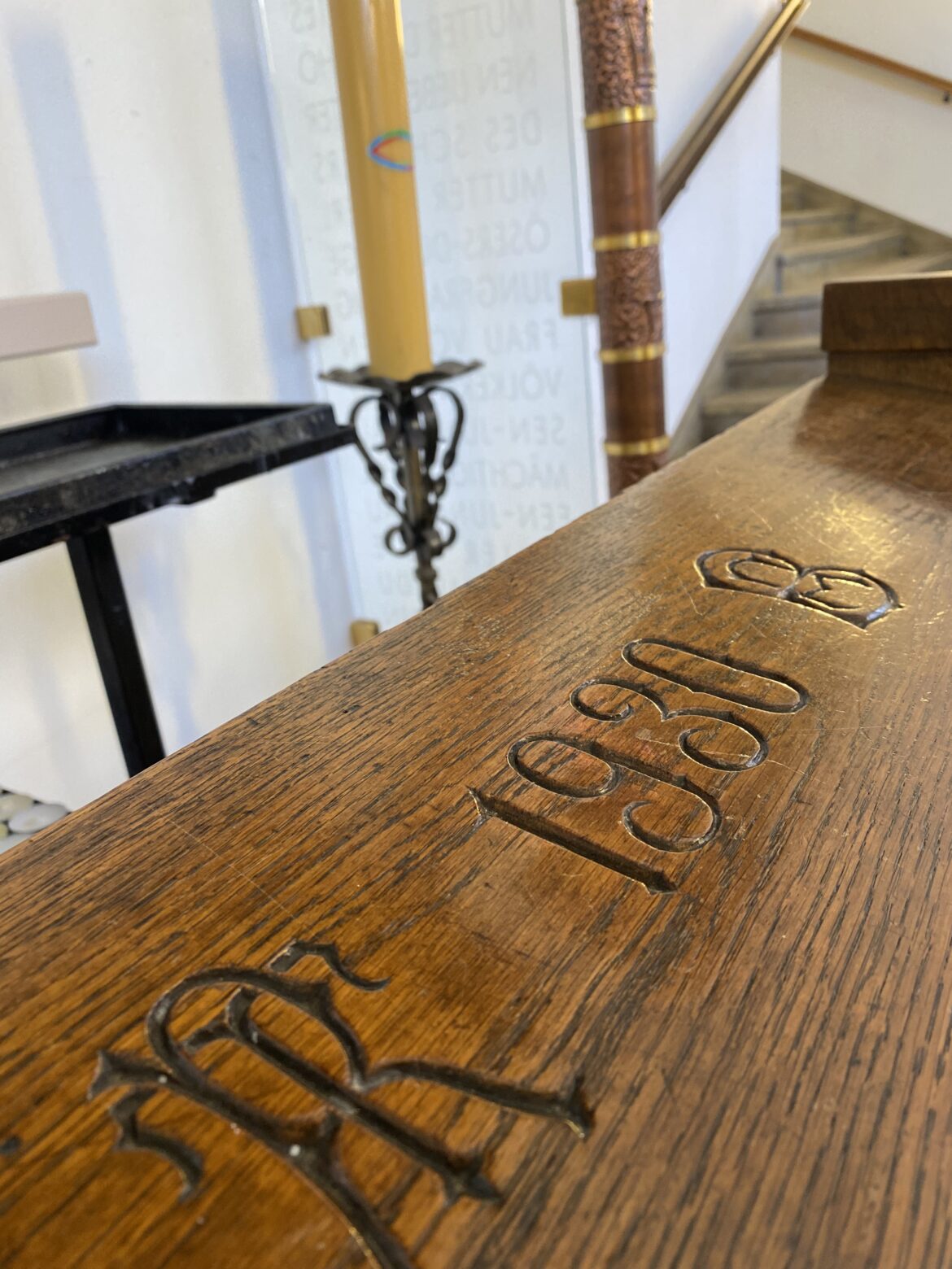 Auf einer Kirchenbank liegen mehrere Fotos hintereinander, die Szenen aus früheren Messen der Sankt Gertrud zeigen. Auf einem Foto sieht man mehrere Männer in weiß-lila Gewändern.