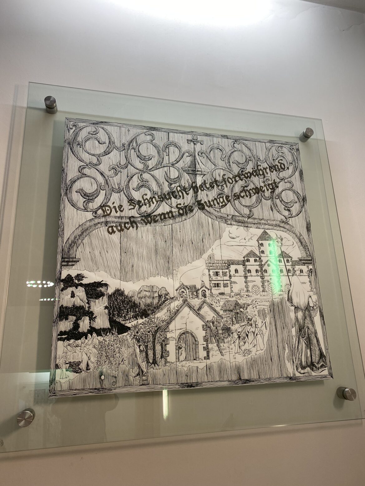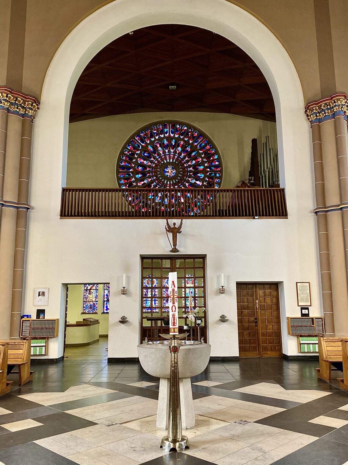 Einen Tag vor dem letzten Sonntagsgottesdienst in der Kirche Sankt Gertrud öffnet diese ihre Türen für alle, die Abschied nehmen möchten. Wenige Menschen schlendern durch die Kirche oder sitzen auf den Bänken und betrachten das riesige Wandmosaik hinter dem Altar. Einige nehmen neugierig ausgelegte Fotos hoch, auf denen ehemalige Pastore, Gemeindereferenten und Messdiener zu sehen sind. Andere – machen Fotos mit einer gemieteten Selfie-Box. Ein Pastor lacht, als sein Foto zu früh geschossen wird. Hinter ihm steht eine große Holzfigur der Heiligen Gertrud. Um ihre Füße liegen Blumen. Auf dem ausgedruckten Foto steht: „Abschied von St. Gertrud – 21.06.2025“. Zarte grüne Blätterranken zieren den Rand des Bildes.