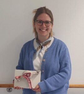 Lena zeigt die Endometriose-Herde am Modell eines Uterus.