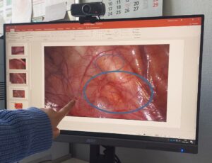 Lena Hofmann deutet auf den Endometriose-Herd, den man auf dieser Aufnahme sehr gut erkennen kann.