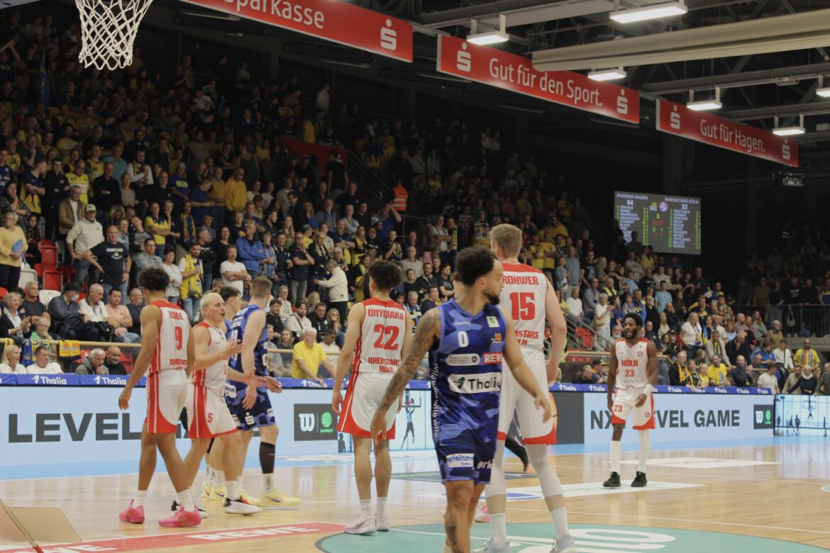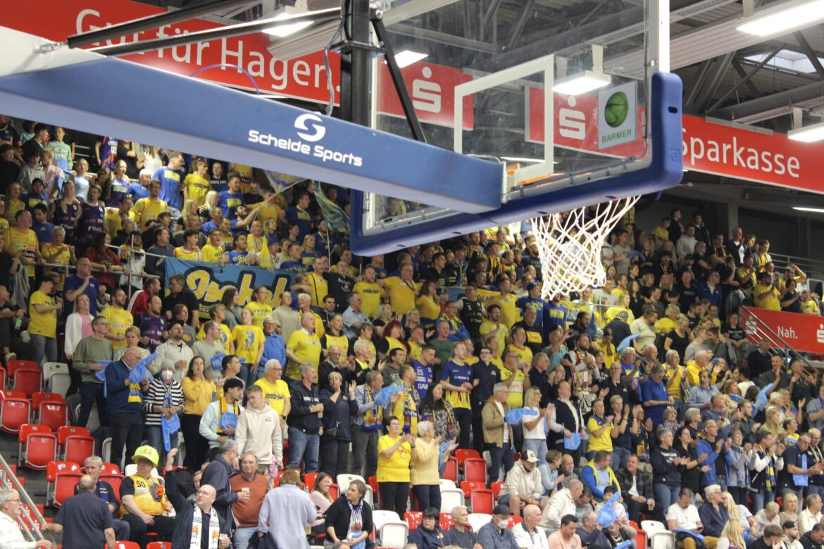Als Dennis Nawrocki seinen ersten Dreier trifft, explodiert alles gleichzeitig: Trommeln donnern; Menschen springen; Schals fliegen nach oben; Stimmen überschlagen sich. Bei jedem Freiwurf herrscht kurz gespannte Stille. Es ist sogar das Quietschen der Schuhe auf dem Parkett zu hören, bis wieder Jubel ausbricht oder Pfiffe zu hören sind, je nachdem, wer wirft. Die Stimmen im Block werden lauter: „Wir sind alle Hagener Jungs.“ Begleitet wird der Gesang vom dumpfen Schlag dutzender Trommeln. Ein Fan trägt eine glitzernde Kette mit einem Anhänger darauf; andere halten ihre Schals hoch über Kopf. Pascal springt vorne unermüdlich weiter, das Megafon fest umklammert.