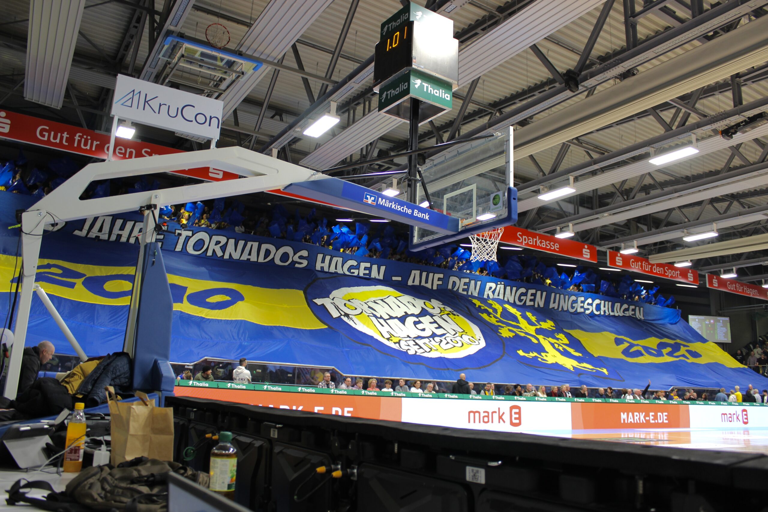 Ganz vorne steht Pascal Teske am Geländer, das Megafon locker in der Hand. Er gehört zu den Tornados, jener Fanszene von Phoenix Hagen, die seit Dezember 2010 existiert und für Stimmung sorgt wie kaum eine andere Fangruppe im deutschen Basketball. Damals war es eine Freundesgruppe von etwa fünfzehn Leuten – sie wollten einfach laut sein und die Halle zum Beben bringen. Der Name Tornados stammt nicht aus Hagen selbst: Die Gruppe hat ihn sich von einer Fußballmannschaft aus Österreich abgeschaut. „Das klang halt cool“, sagt Pascal lachend. Seit 2010 ist die Gruppe gewachsen. Heute gehören offiziell 27 Personen zum Kern der Tornados, auf dem Heuboden stehen aber regelmäßig weit mehr als 60 oder 70 aktive Fans. Wenn Phoenix spielt, ist es immer voll.