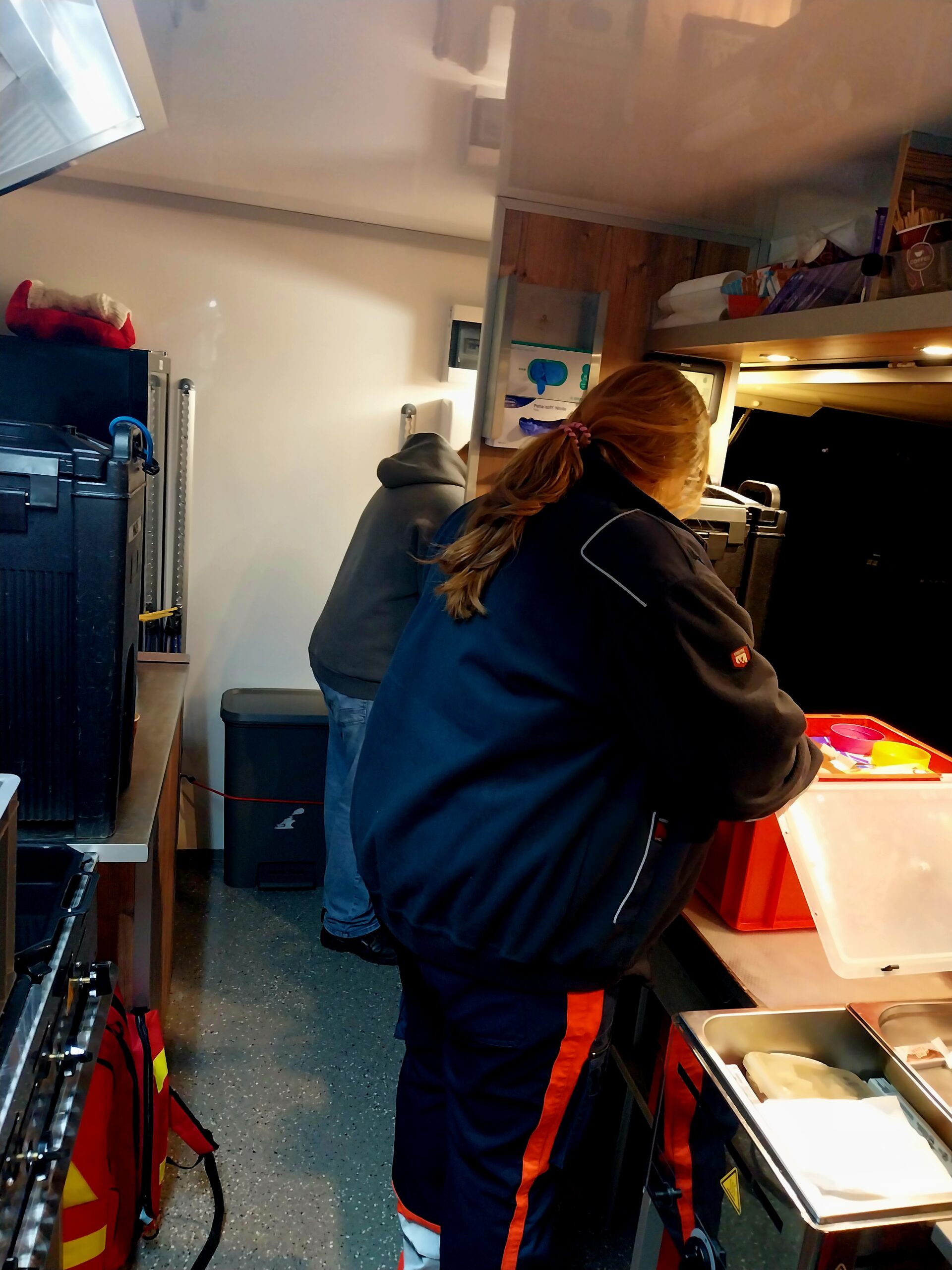 Der erste Andrang ist inzwischen vorbei, die erste Box an 5-Minuten-Terrinen muss nachgefüllt werden. Vor allem der Gulaschtopf ist hoch im Kurs. Um nachzufüllen, räumt das Team um. Der Platz im Wärmebus ist dann doch sehr eng. Trotz des begrenzten Platzes und der wartenden Menschen bricht nie Hektik aus. Die Ehrenamtlichen nehmen sich Zeit für jede einzelne Person.