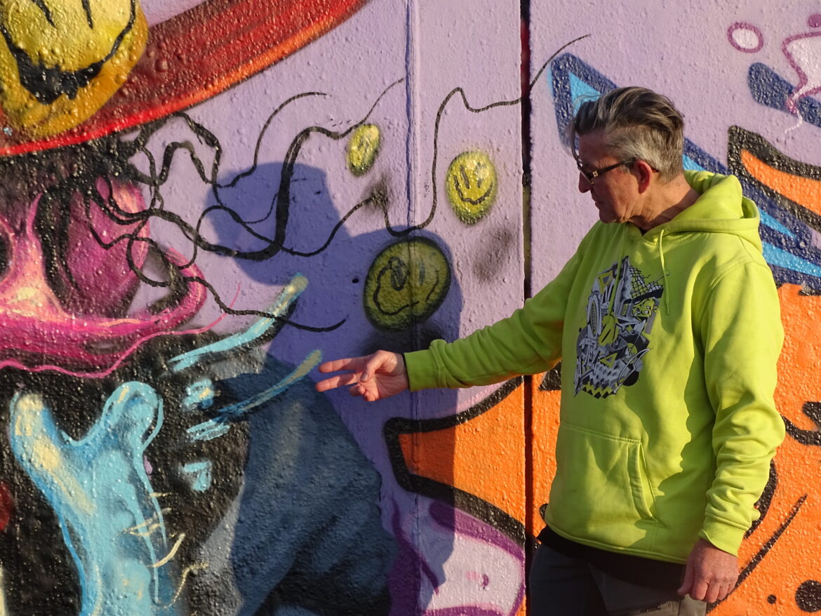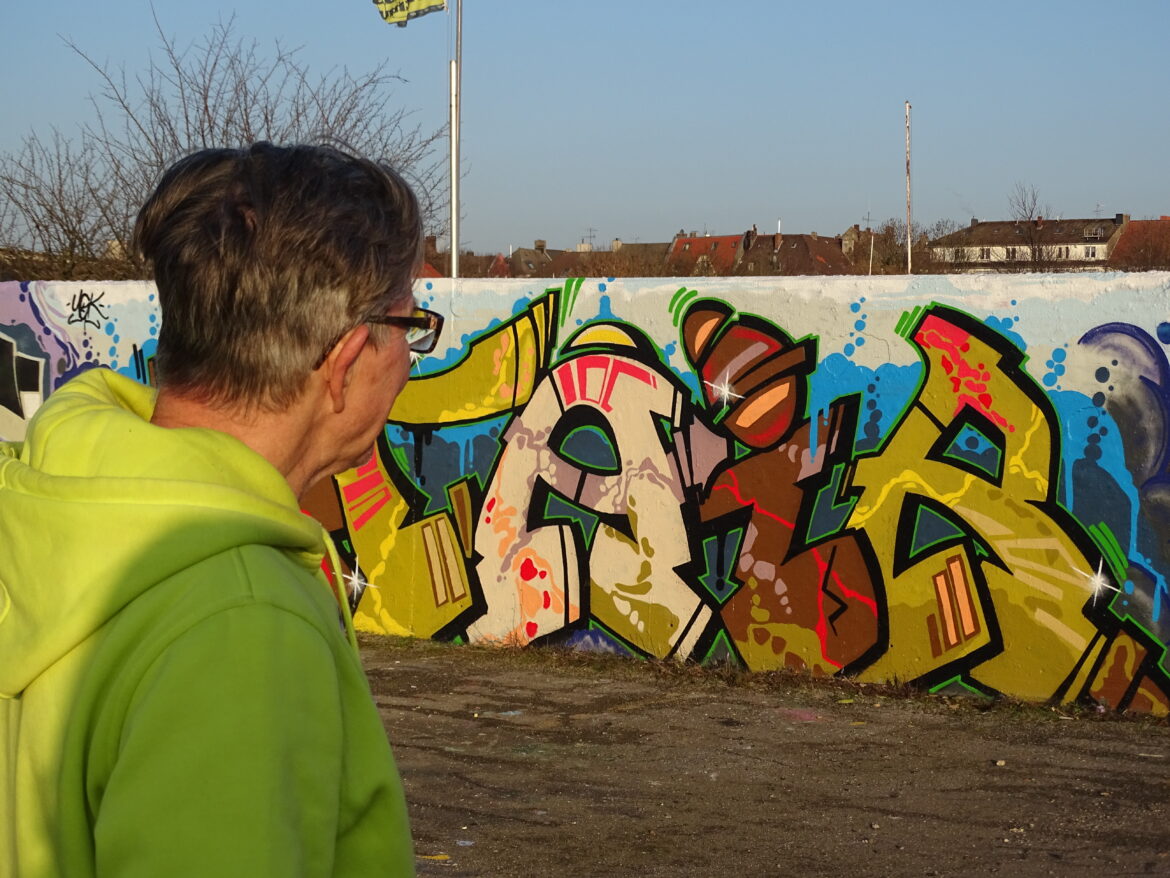 Auf dem Weg zur Graffiti-Wand hält Schorsch immer wieder an, um ein Kunstwerk auf einer Hausfassade oder auch Sticker an einem Laternenpfahl zu begutachten. Zu fast jedem Bild und Kürzel kann er etwas erzählen. Die meisten der Künstler*innen hat er schon getroffen.