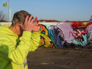 Es ist ein kalter, sonniger Wintertag. Georg Jeutsch steht unterhalb des Dortmunder U, an der legalen Graffiti-Wand. Hinter ihm fahren die Züge in den Bahnhof ein. Ansonsten ist es ruhig. Georg trägt eine Regenjacke, einen schwarzen Rucksack und Brille.