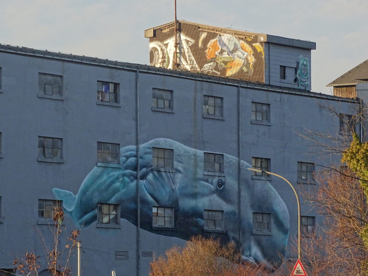 Dortmund ist schon geil, hier ist immer was los. Die Dortmunder Szene hat mich sehr geprägt. Vor ungefähr vier Jahren bin ich hier aktiv eingetaucht. Damals wurde am Hafen die große Hall of Fame eröffnet. Ich bin mit dem Fahrrad hergefahren und habe zufällig Denis Klatt kennengelernt. Das ist ein bekannter Auftragskünstler in Dortmund, der direkt am Hafen sein Atelier hat. An der Hausfassade habe ich mir damals ein Bild von ihm von einem riesigen Blauwal angeguckt und bin mit dem Fahrrad über die Einfahrt in den Hinterhof gefahren, um zu schauen, was da los ist. Das hat er gesehen und wir kamen ins Gespräch. Er hat mir eine Leinwand mit dem Wal-Bild darauf geschenkt – obwohl wir uns gar nicht kannten. Und damit hatte ich dann einen freundschaftlichen Kontakt hier in Dortmund.