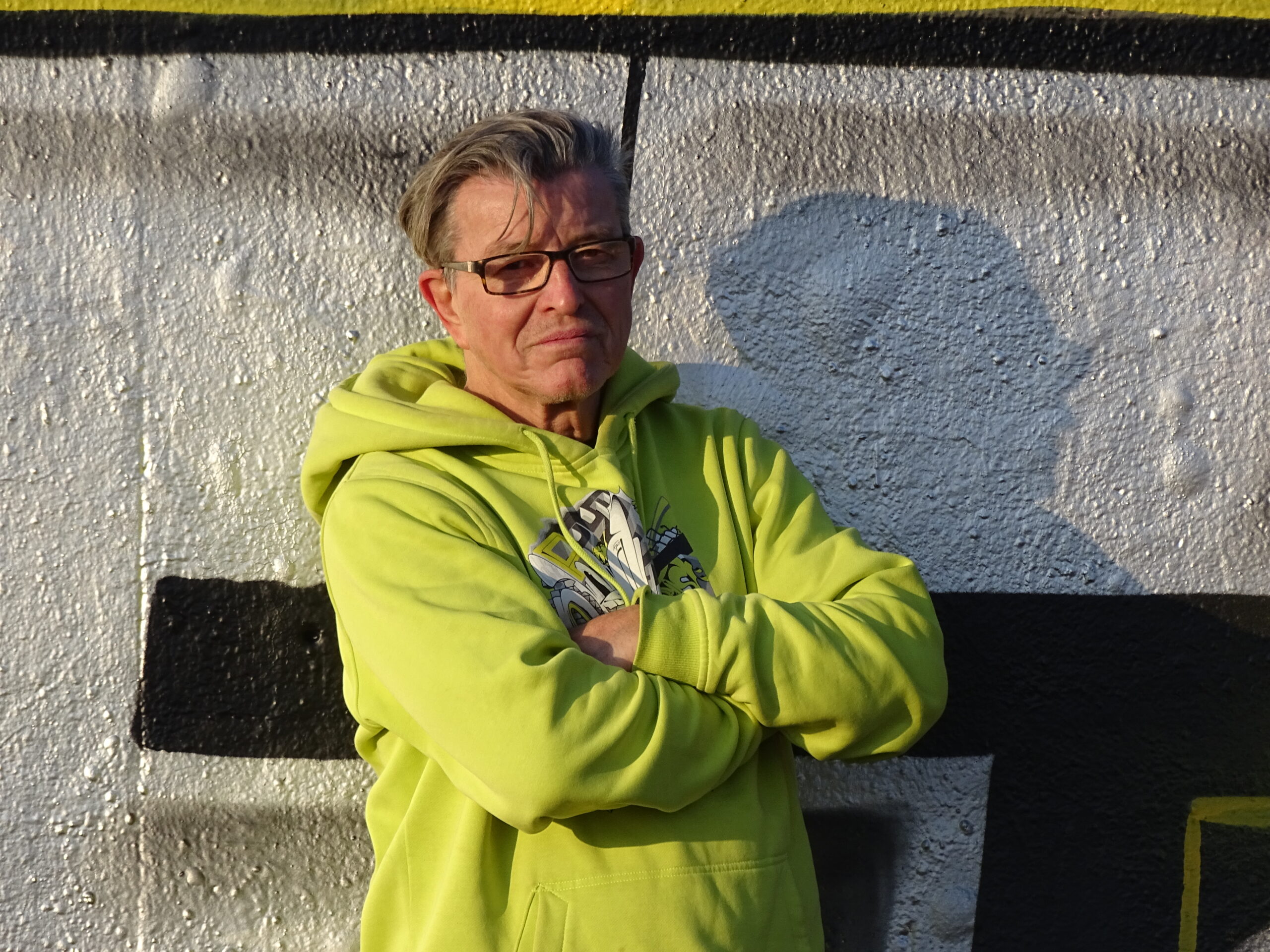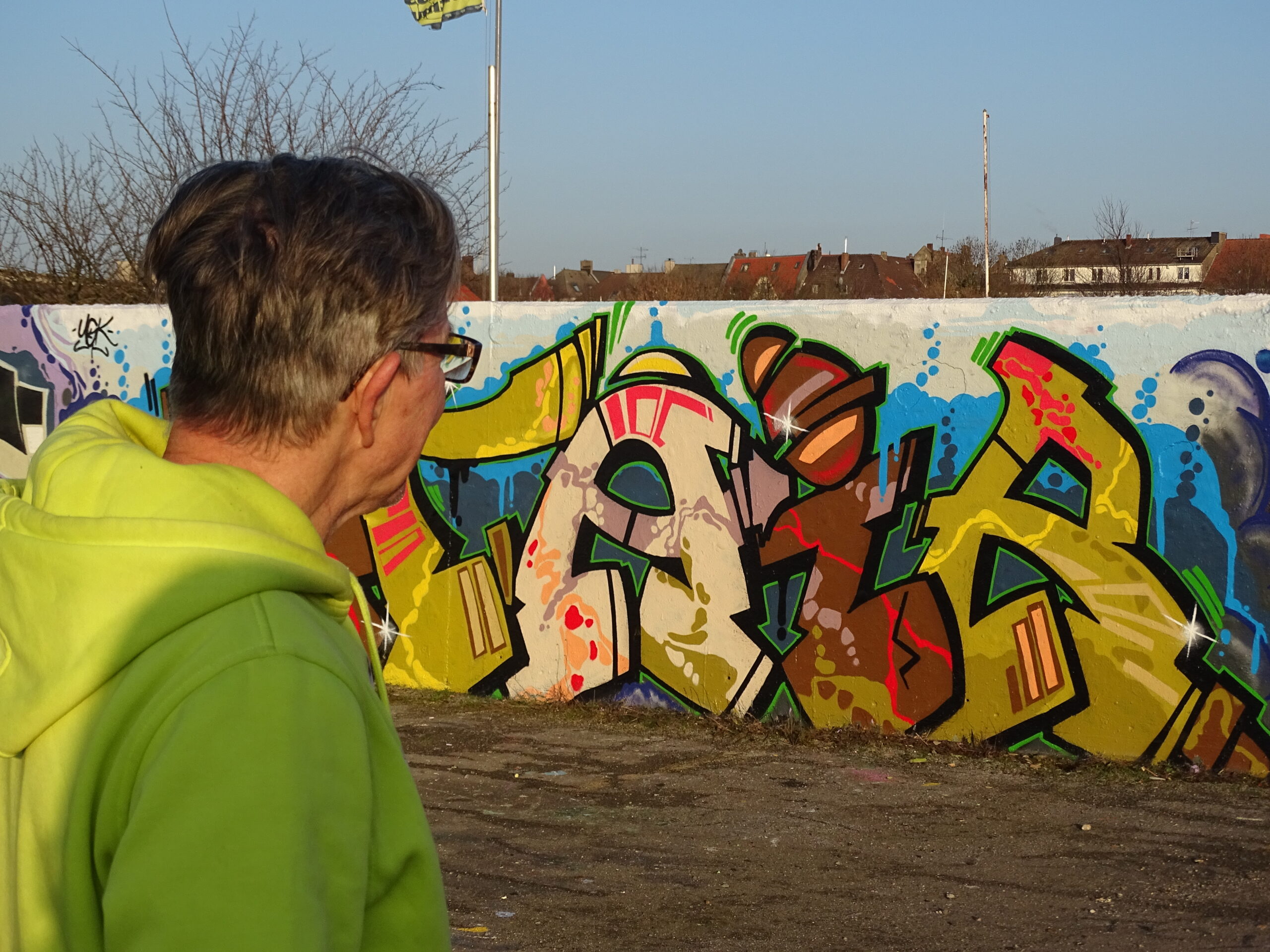 Es ist ein kalter, sonniger Wintertag. Georg Jeutsch steht unterhalb des Dortmunder U, an der legalen Graffiti-Wand. Hinter ihm fahren die Züge in den Bahnhof ein. Ansonsten ist es ruhig. Georg trägt eine Regenjacke, einen schwarzen Rucksack und Brille.