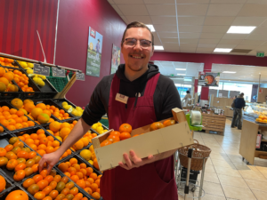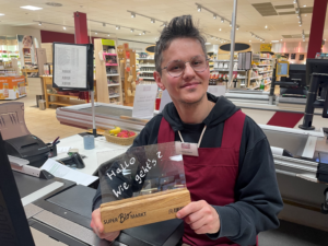 Anders als Mehmet verbringt Tom seine Schicht nicht an der Kasse, sondern auf der Fläche. Der 29-Jährige ist Schichtleiter und arbeitet seit Juli 2021 im Superbiomarkt. Zuerst sei er sich unsicher gewesen, ob Bio etwas für ihn sei, erinnert er sich. Doch jetzt würde er nicht mehr wechseln wollen. „Man muss einen Laden finden, der zu einem passt, zur eigenen Persönlichkeit. Sonst macht das Arbeiten keinen Spaß. Mit den richtigen Kollegen ist es noch lustiger”, erklärt Tom. Zu seinen alltäglichen Aufgaben gehört es, die Temperatur der Kühlung und die Mindesthaltbarkeitsdaten zu kontrollieren und die Ware in die Regale einzuräumen.