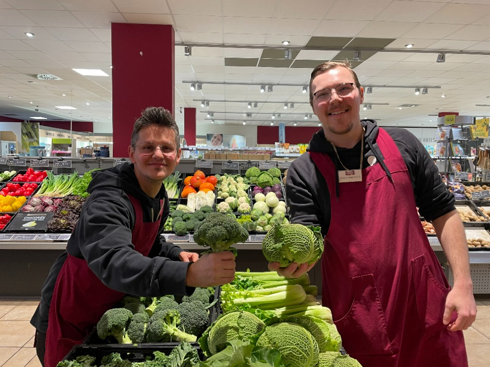 Jeden Morgen wird frisches Gemüse in den Markt geliefert. Und bis zur Ladenöffnung um 8 Uhr muss alles verräumt sein. Die Obst- und Gemüseabteilung ist das Erste, was die Kund*innen sehen, wenn sie den Markt betreten. Auf dem Tisch vor Mehmet bildet sich ein Farbenspiel aus Orange, Rot, Grün, Gelb und sogar Schwarz – alles Karotten. Er hält ein Bund in der Hand. Eins, an dem das Grün noch dran ist. „Die schmecken besser“, sagt Mehmet und wedelt mit dem Gemüse. Ordentlich stapelt er ein Bund auf das andere und Marktleitung Ulrike Saul lobt ihn.
