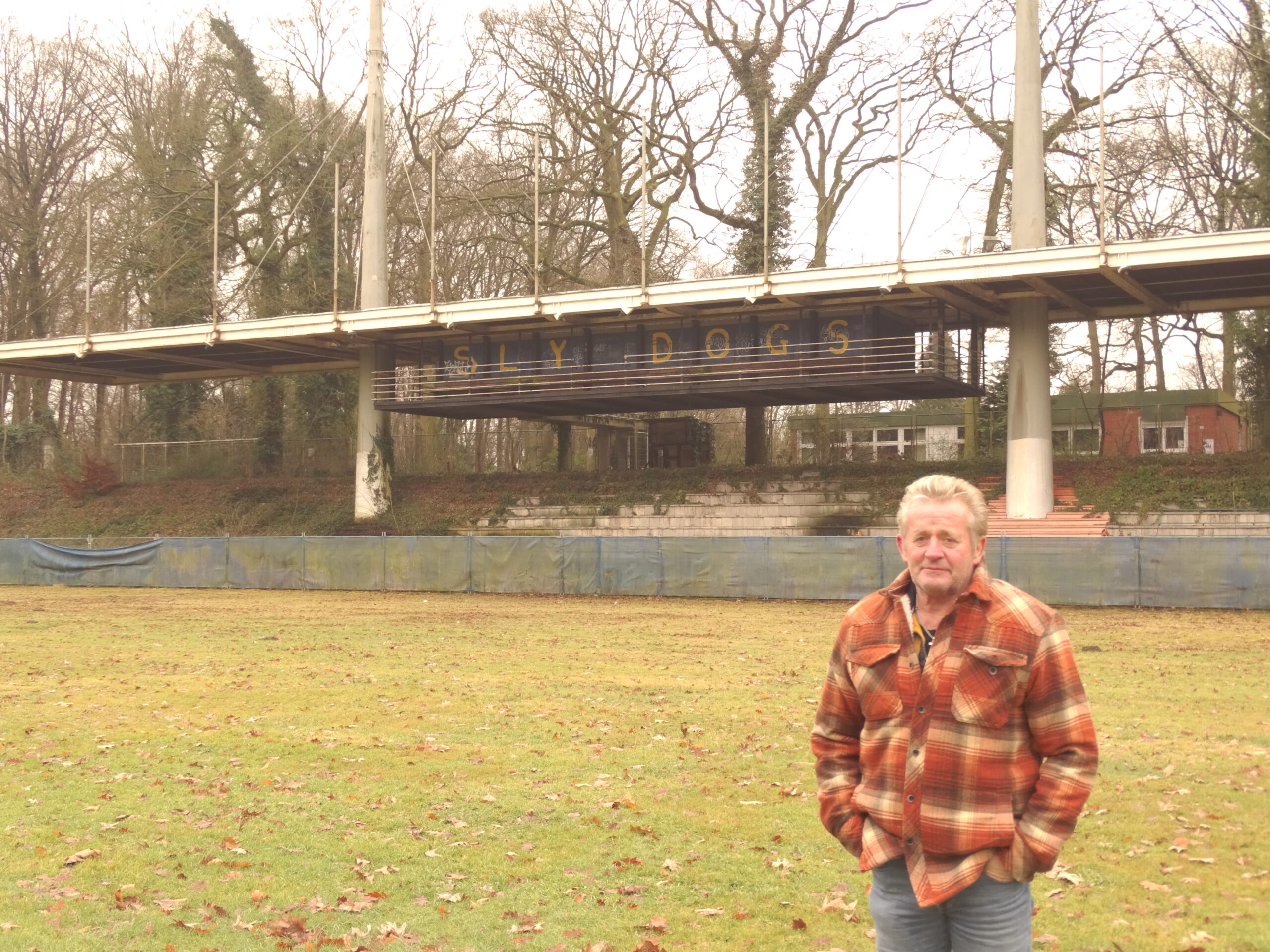 Davor ist ein großes Schloss. Von hier aus sieht Wölpper nur einen kleinen Teil des Rasens. Genau hier trifft er zufällig einen Bekannten. „Du hast nicht zufällig ‘nen Schlüssel?“, fragt Wölpper. „Klar hab‘ ich den“, antwortet Damian Kaiser. Er ist Gründer und Vorstandsvorsitz der „Sly Dogs“, die heute das Stadion nutzen. „Aber nur fünf Minuten, ich muss gleich weiter.“